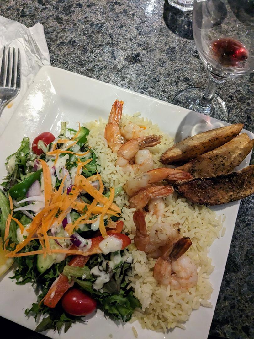 | Crevettes à l'ail (6) Servies avec salade, riz et pomme de terre |